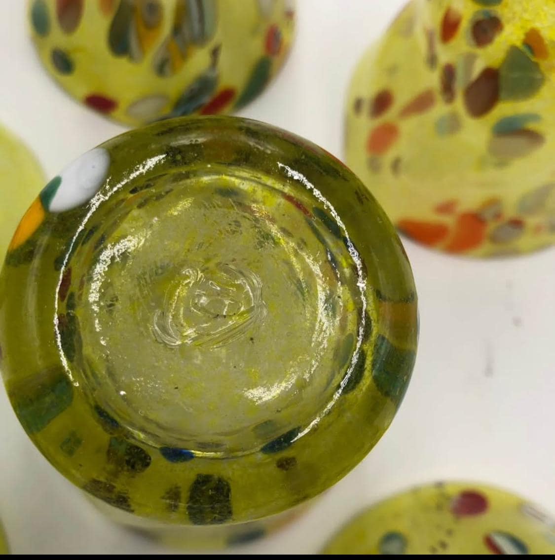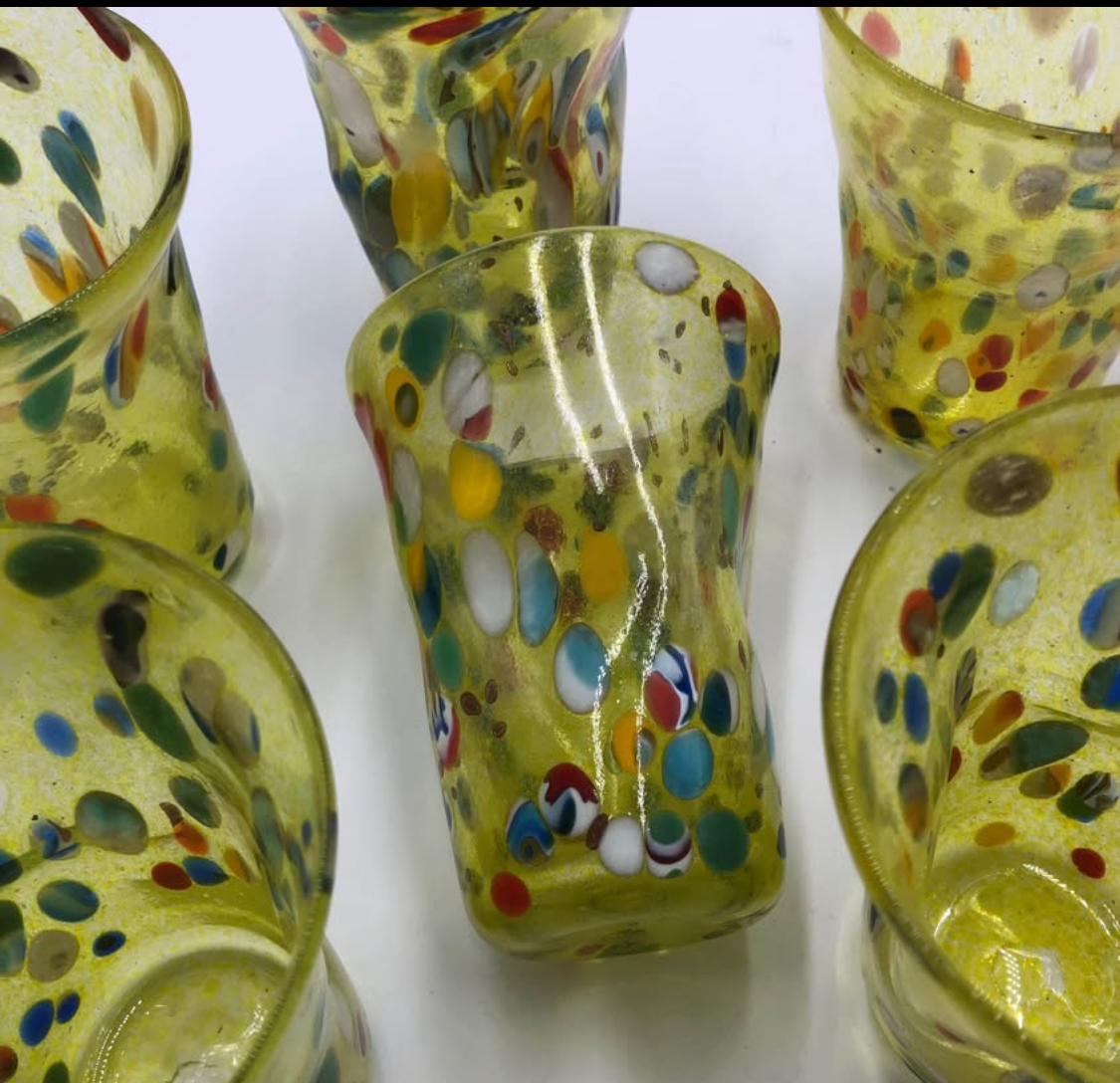 Murano Glass Set of blown glasses "Feuille"Set of six yellow colored glasses with murrine