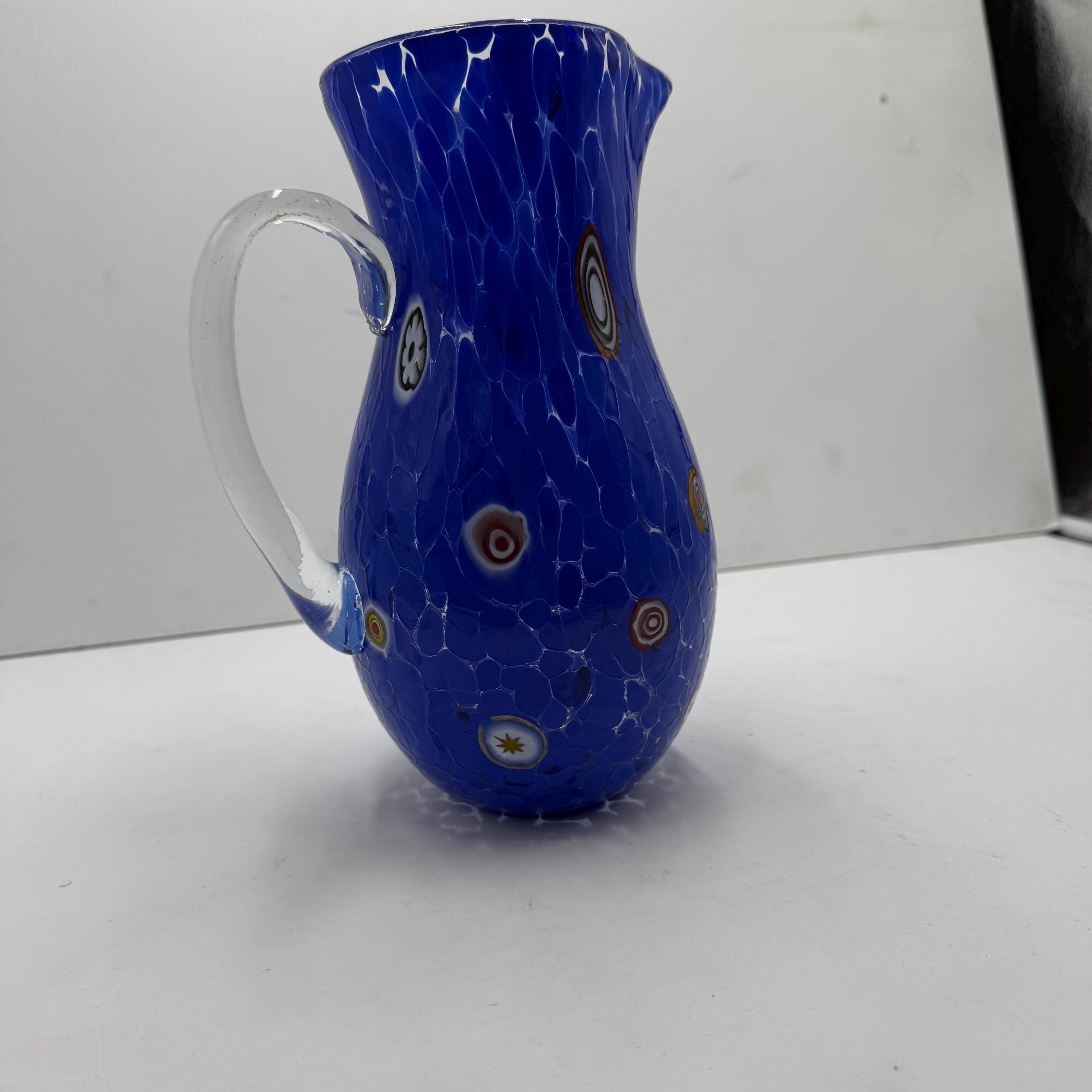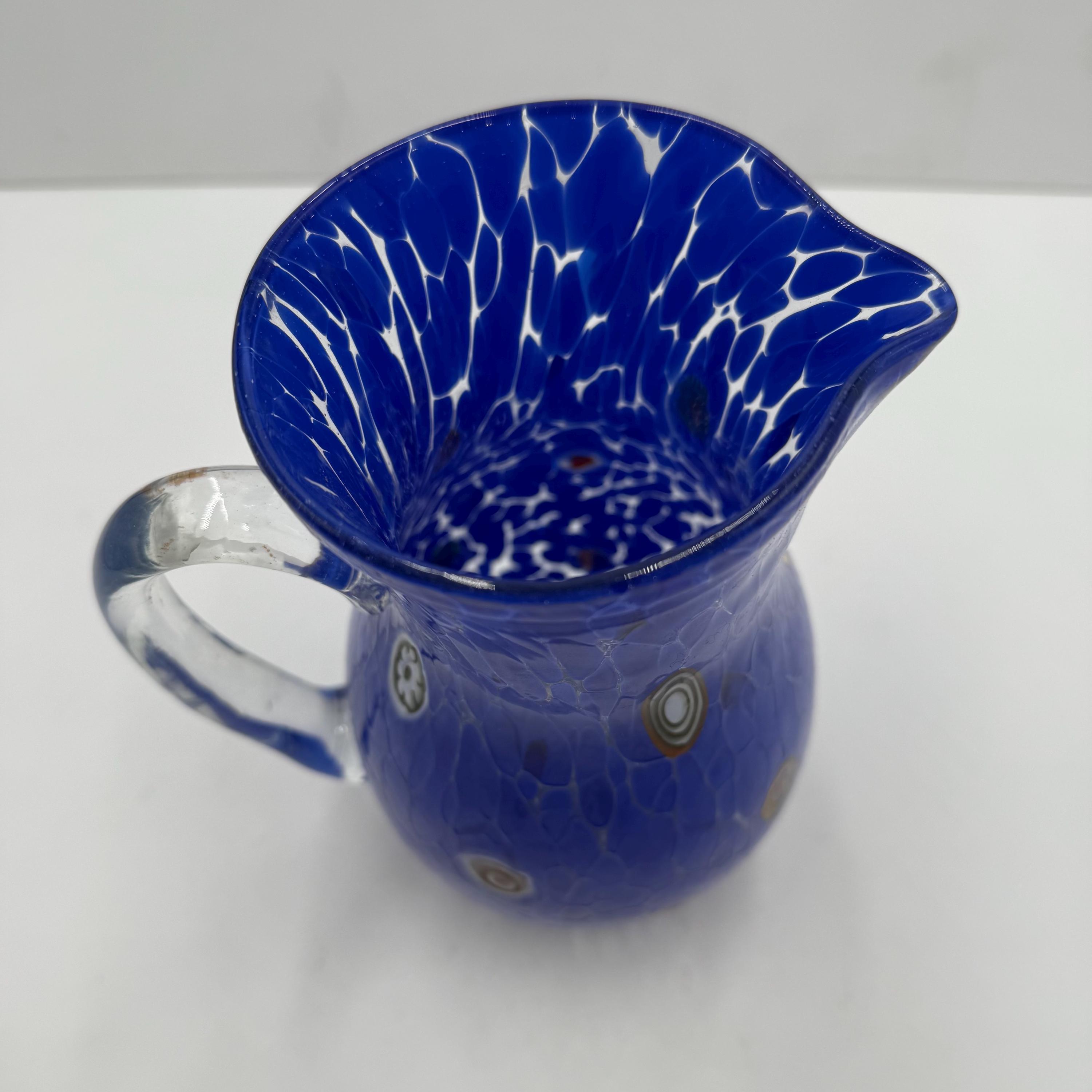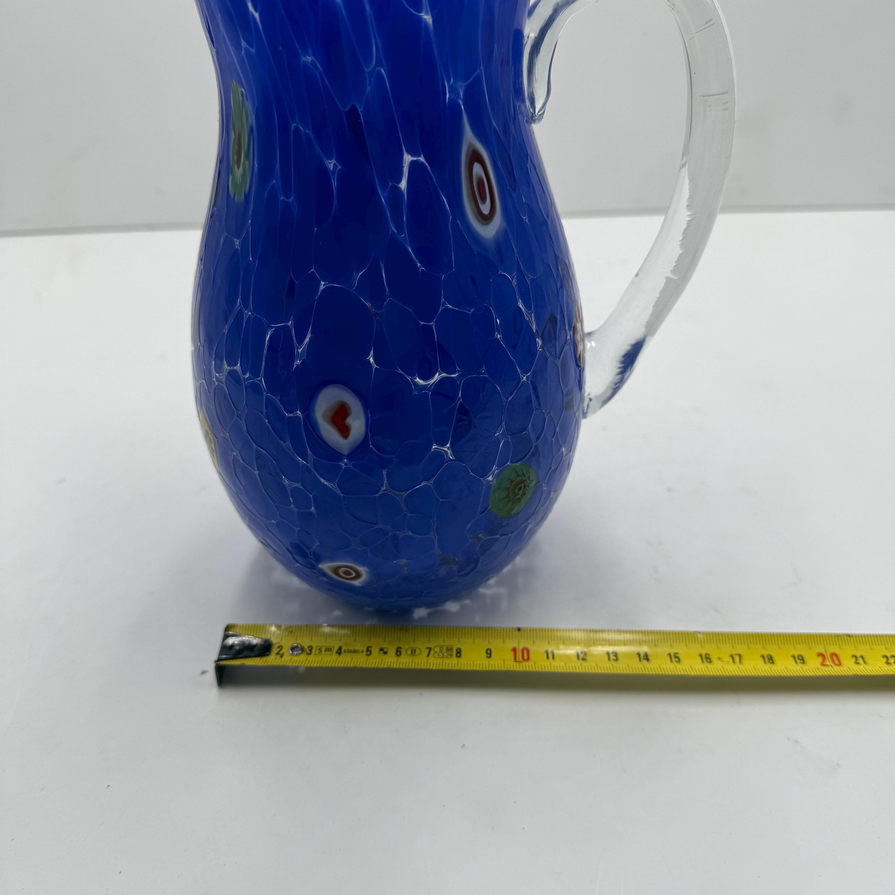 Murano blown glass carafe in clear crystal blue with murrineopened by hand by the master glassmaker.Measurements: height 24 cm, diameter 13 cm