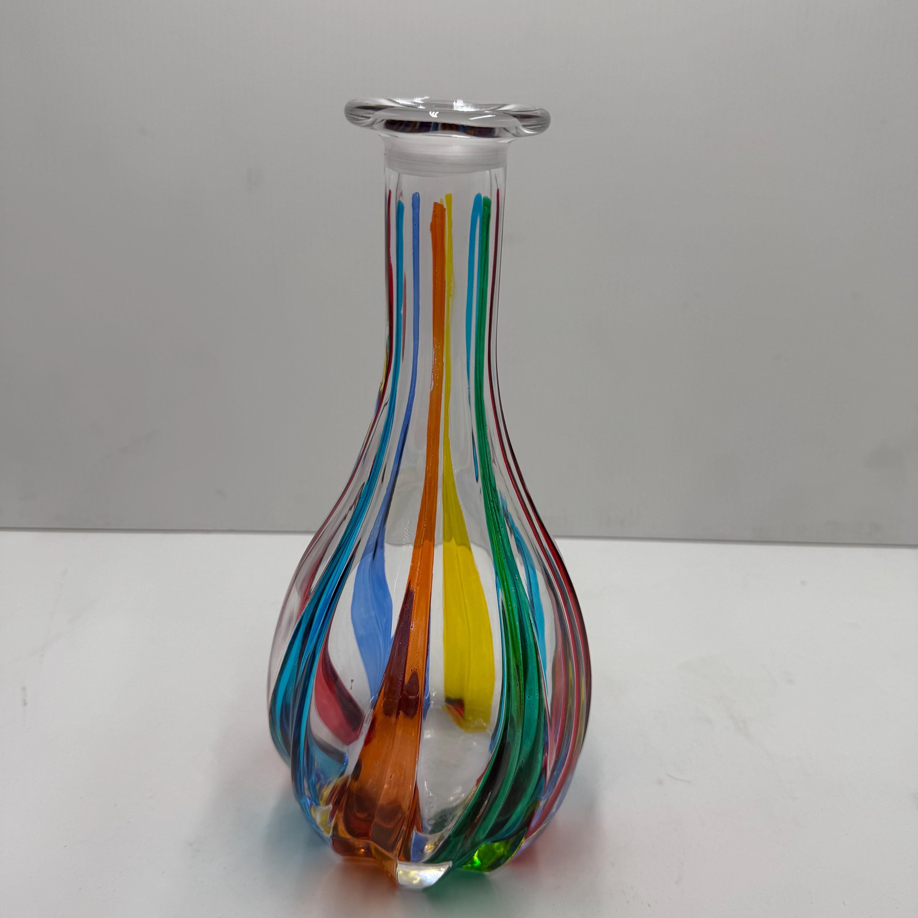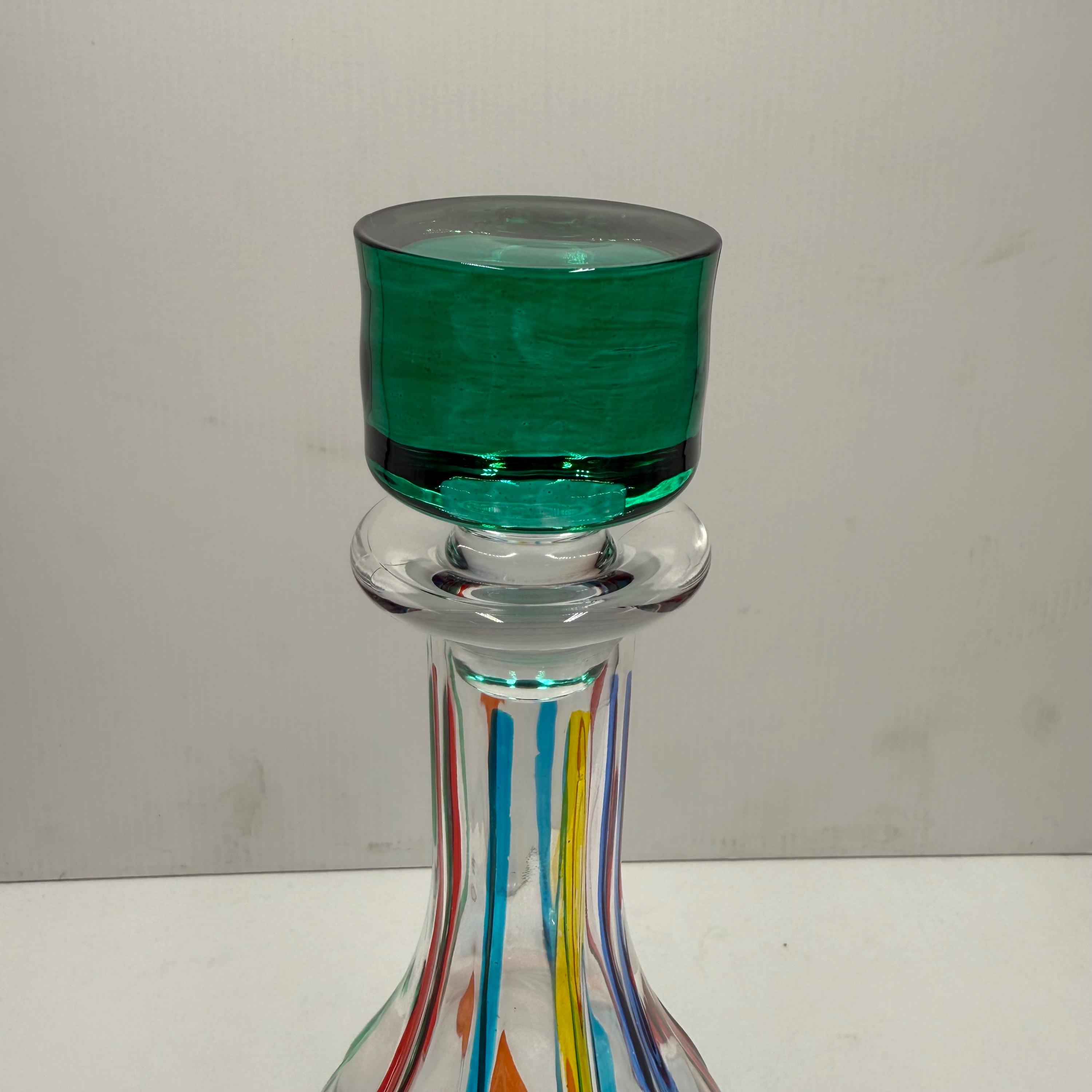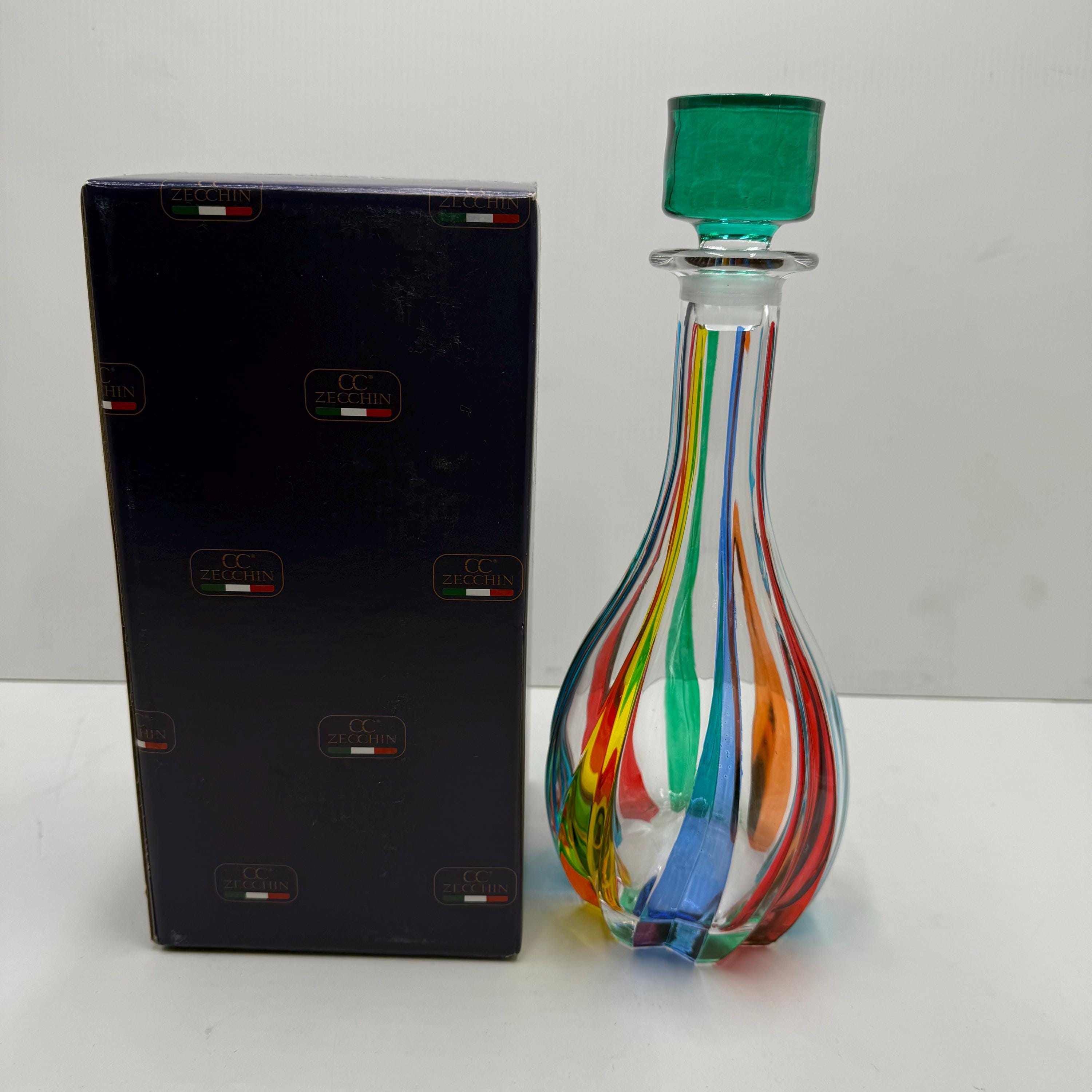 Wine bottle made in Italy and hand-decorated by the Zecchin Murano glassworks with colored enamels, perfectly following the ancient technique of Murano decorators.The bottle measures 30 cm.Original packaging guarantee