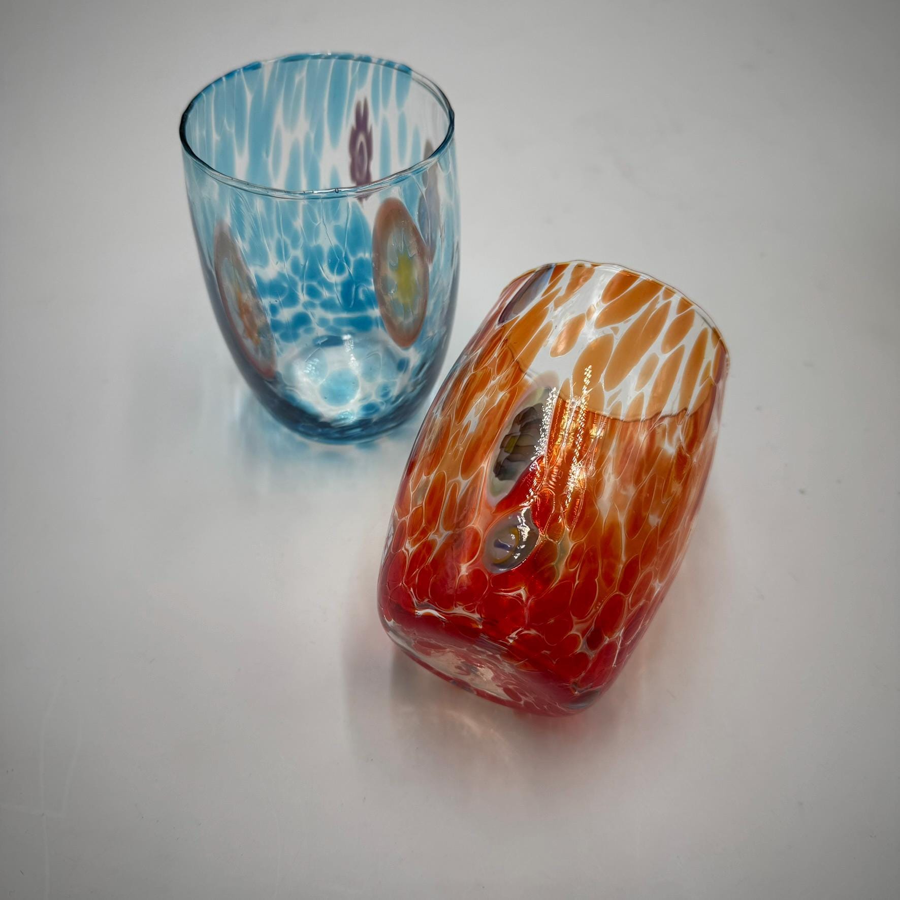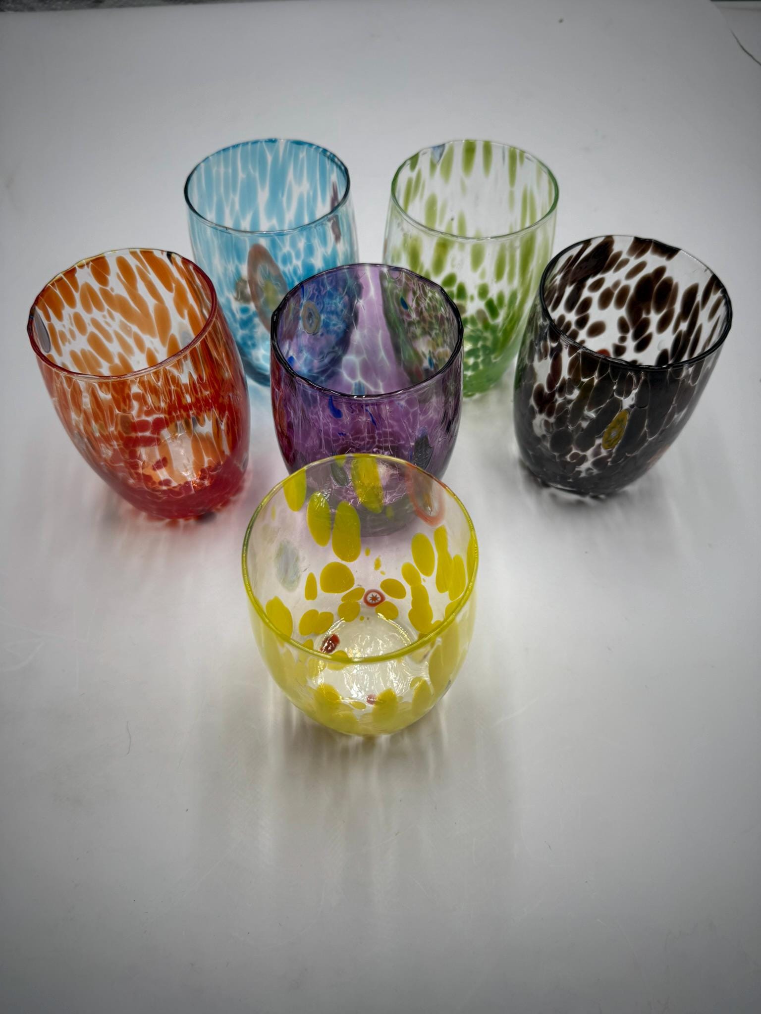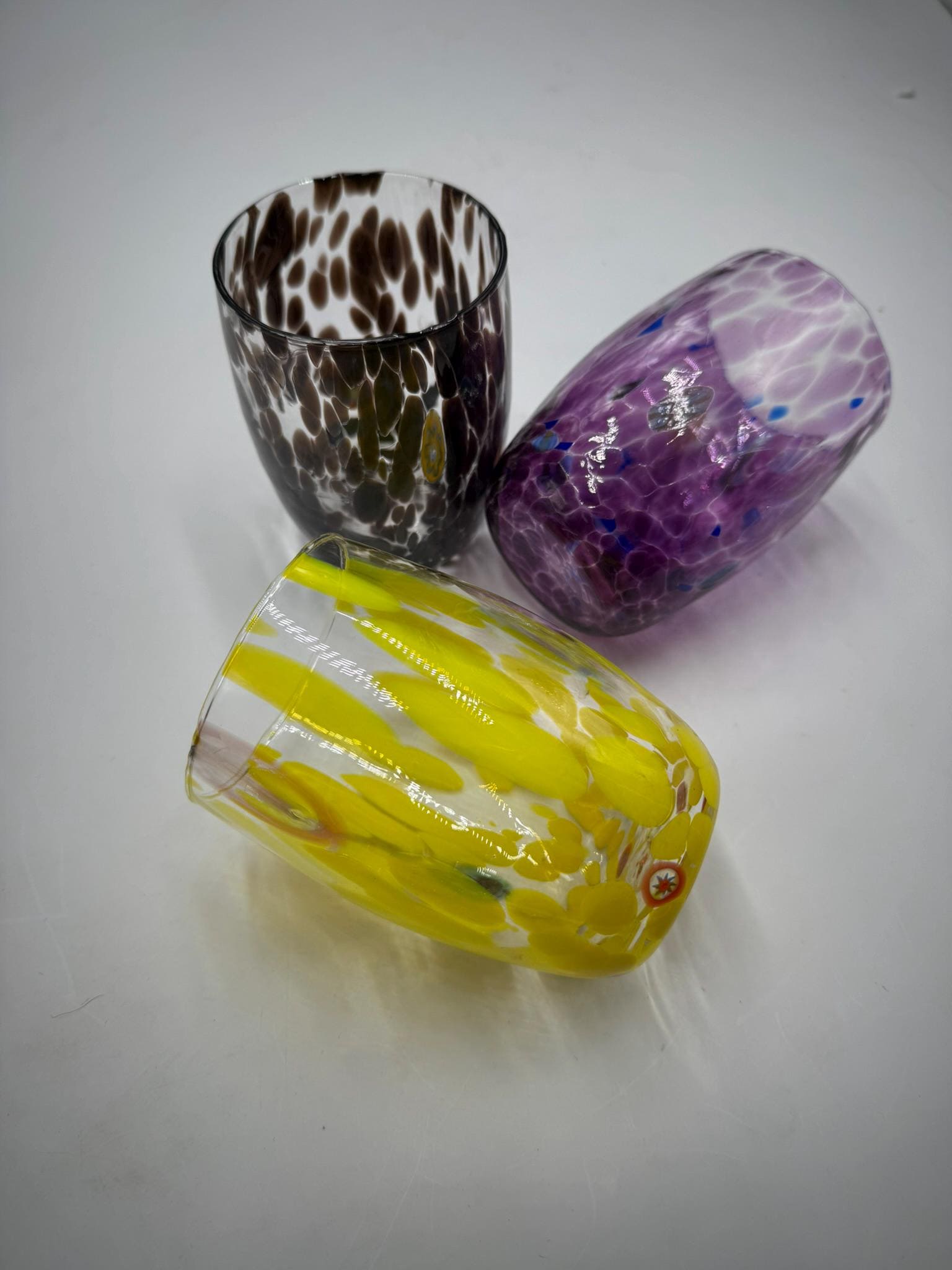 Set of 6 "Botte" glasses in Murano glass, mixed colors, clear crystal.measures height 10 cm diameter 9 cm.