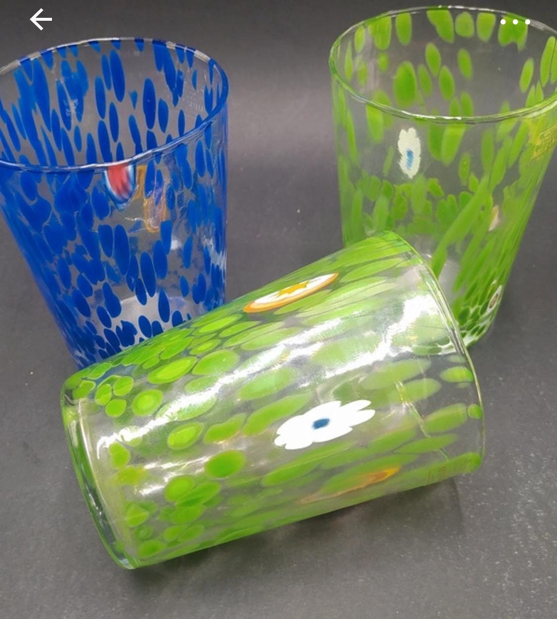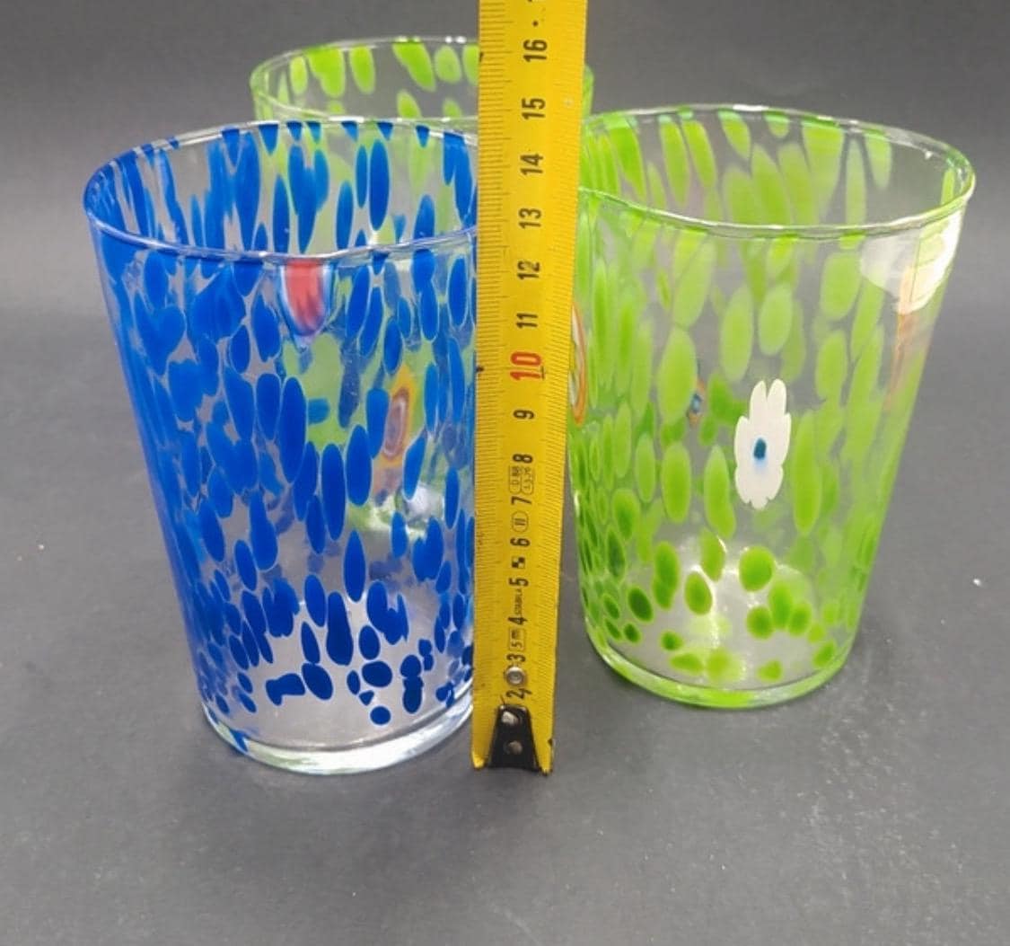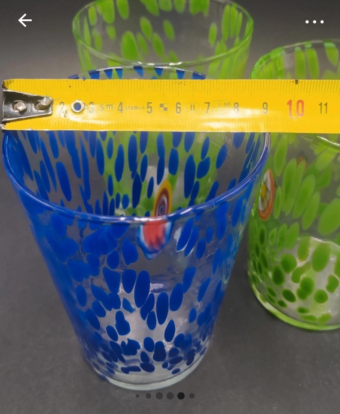 Murano glass 3 small Murano glass glasses from the Zecchin glassworks, green and blue colors.measurements and designer as per photo.Set consisting of 3 pieces in clear crystal and murrine.
