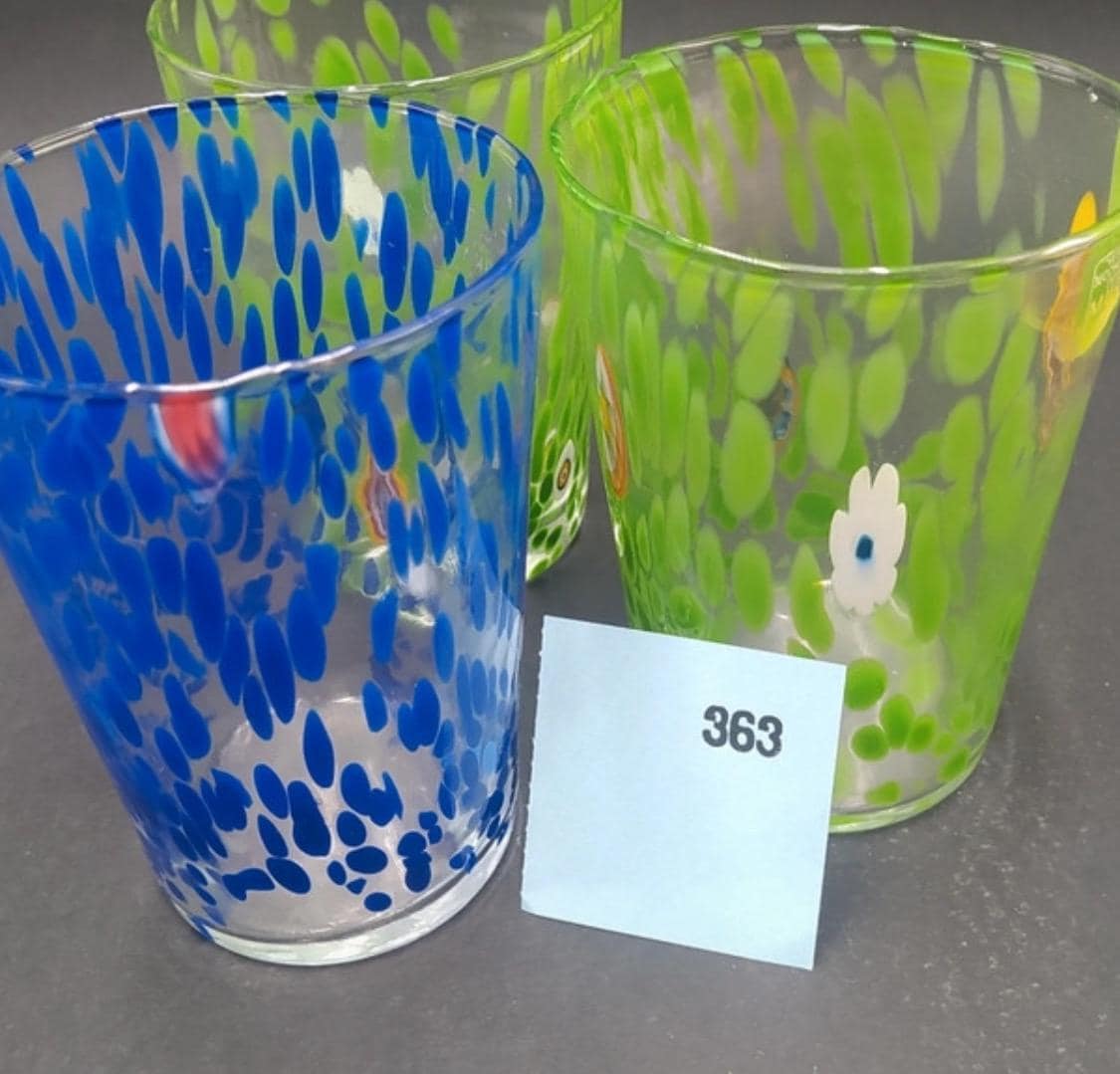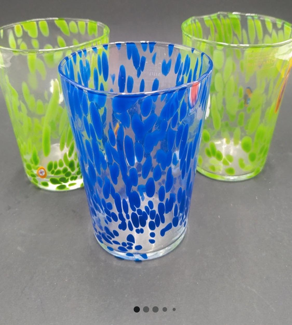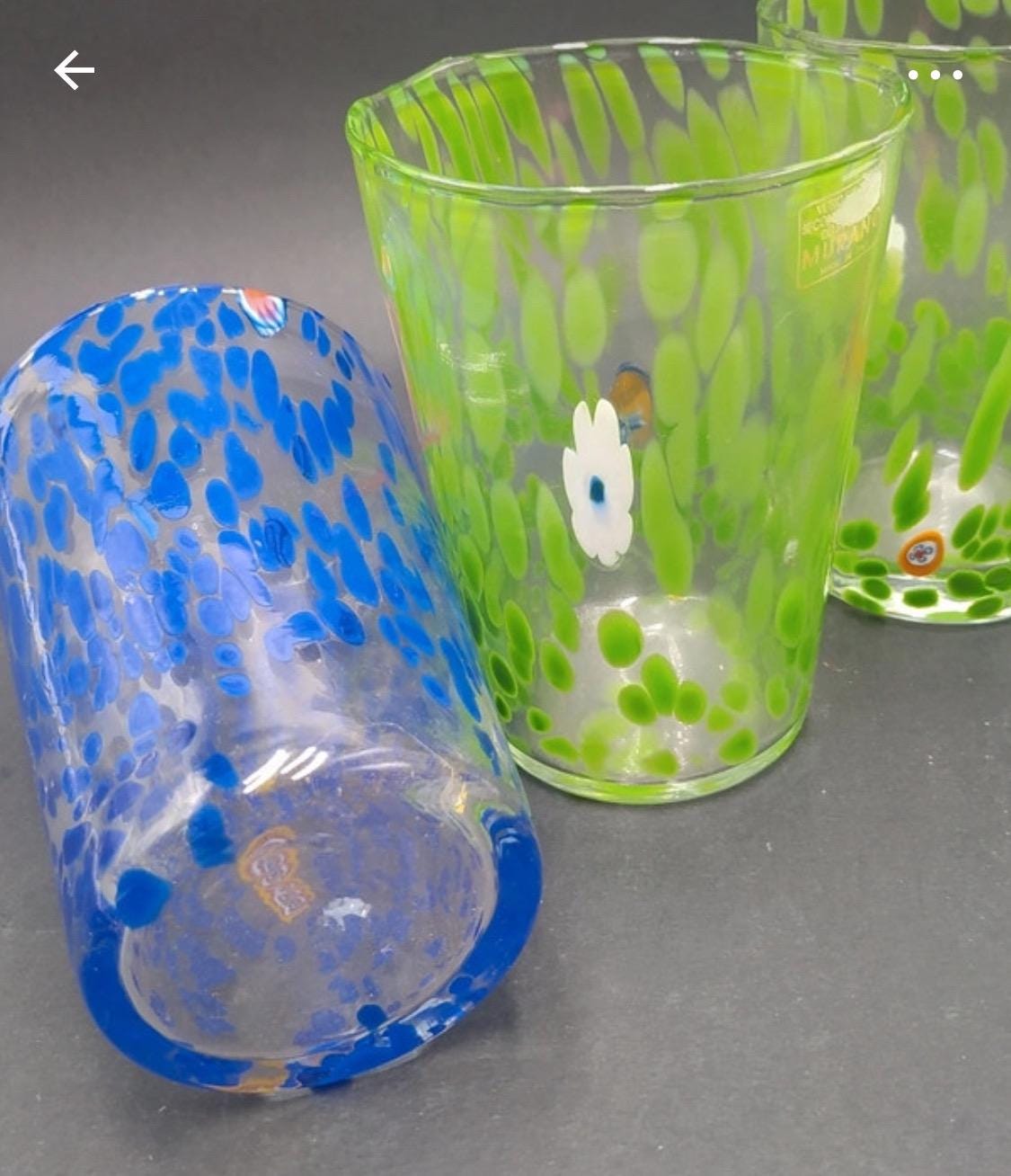 Murano glass 3 small Murano glass glasses from the Zecchin glassworks, green and blue colors.measurements and designer as per photo.Set consisting of 3 pieces in clear crystal and murrine.