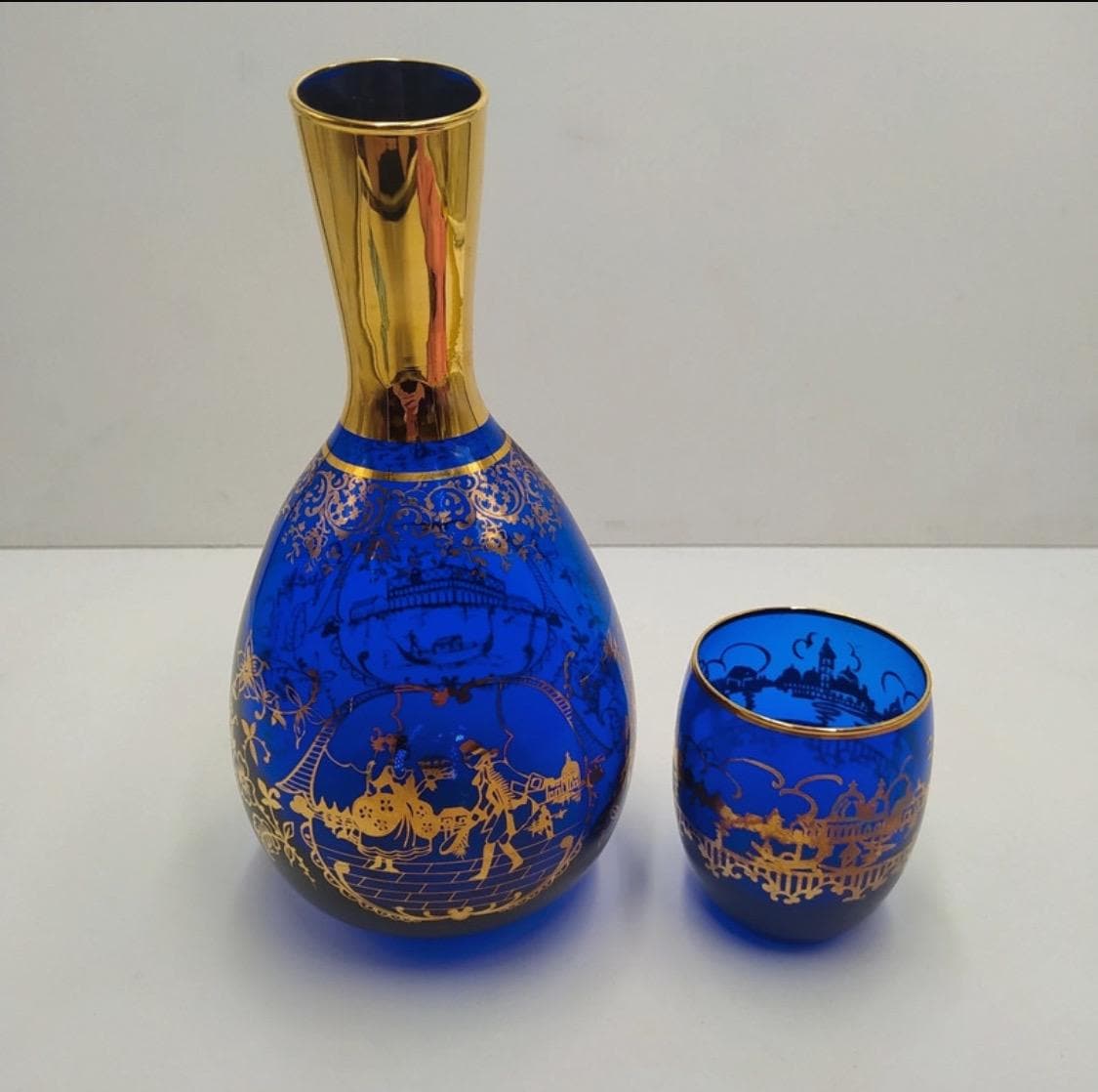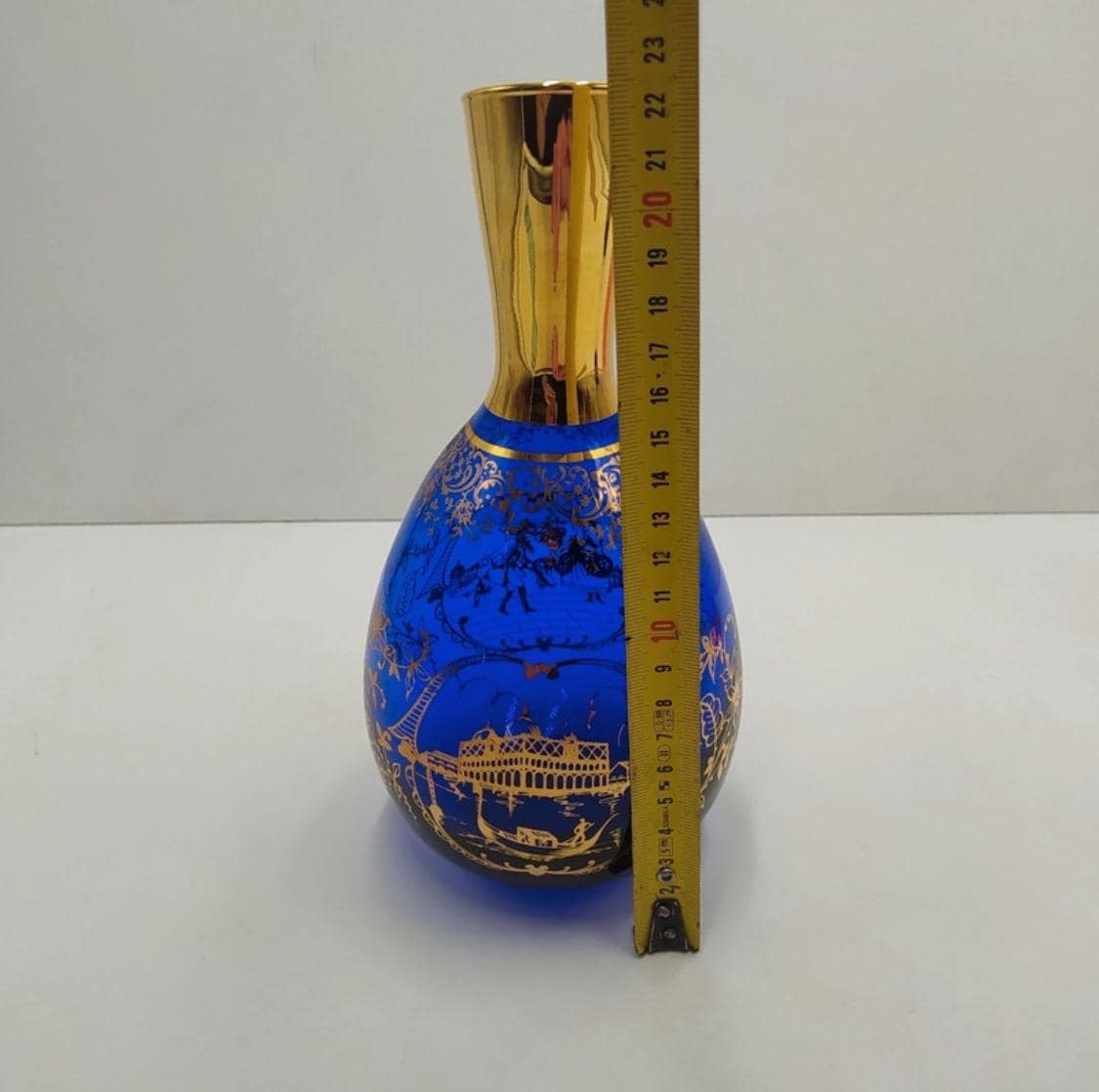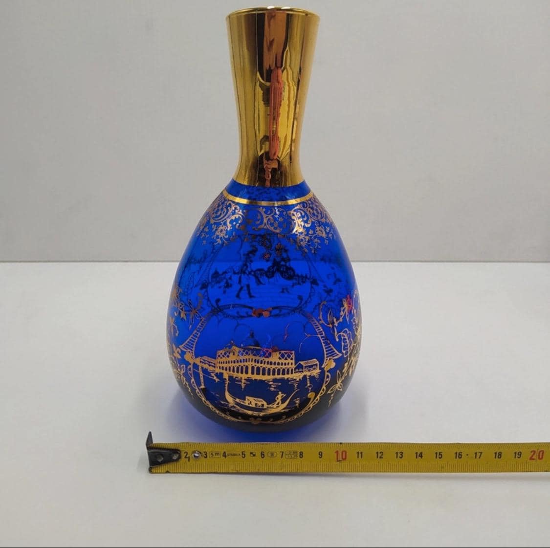 Murano glass bottle with 18kt gold leaf decoration from the Santa Chiara Murano furnace, cobalt blue and gold color.Certificate of origin.Measurements and designer and in photos.
